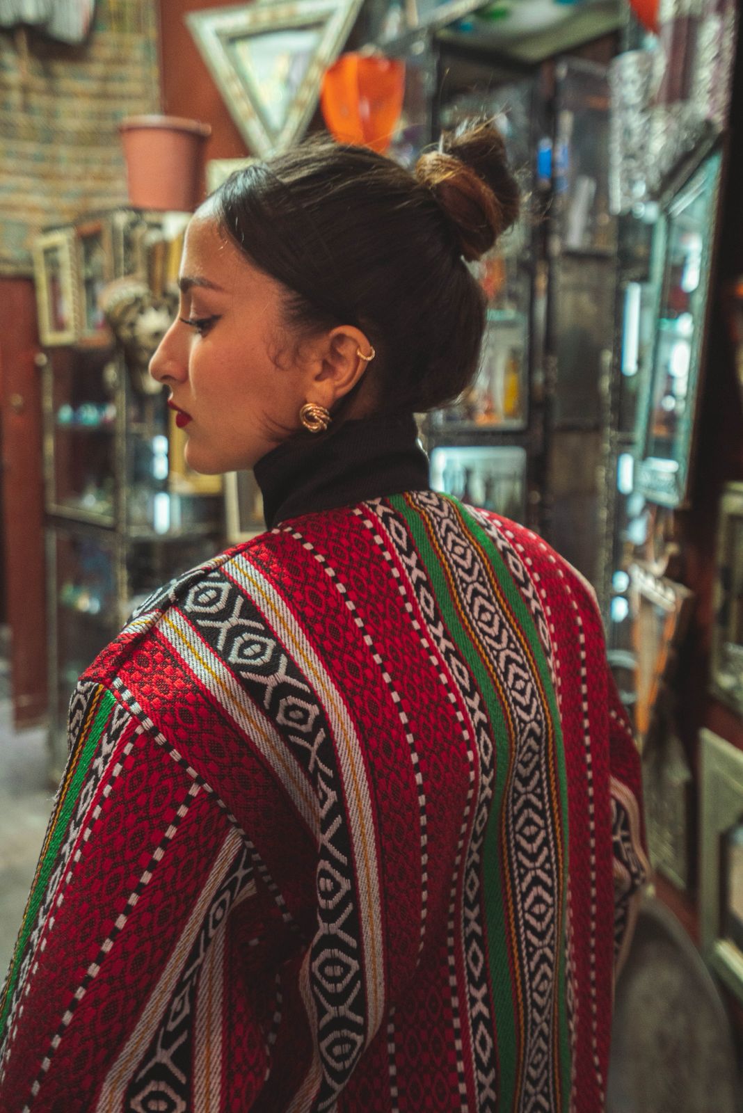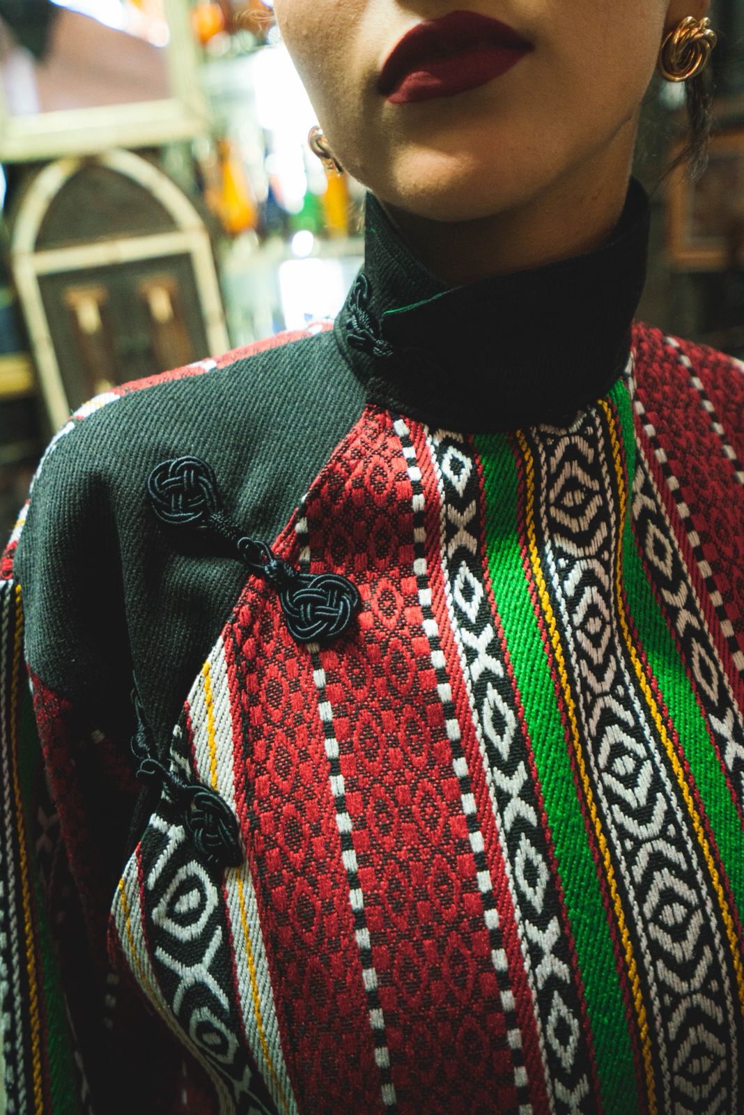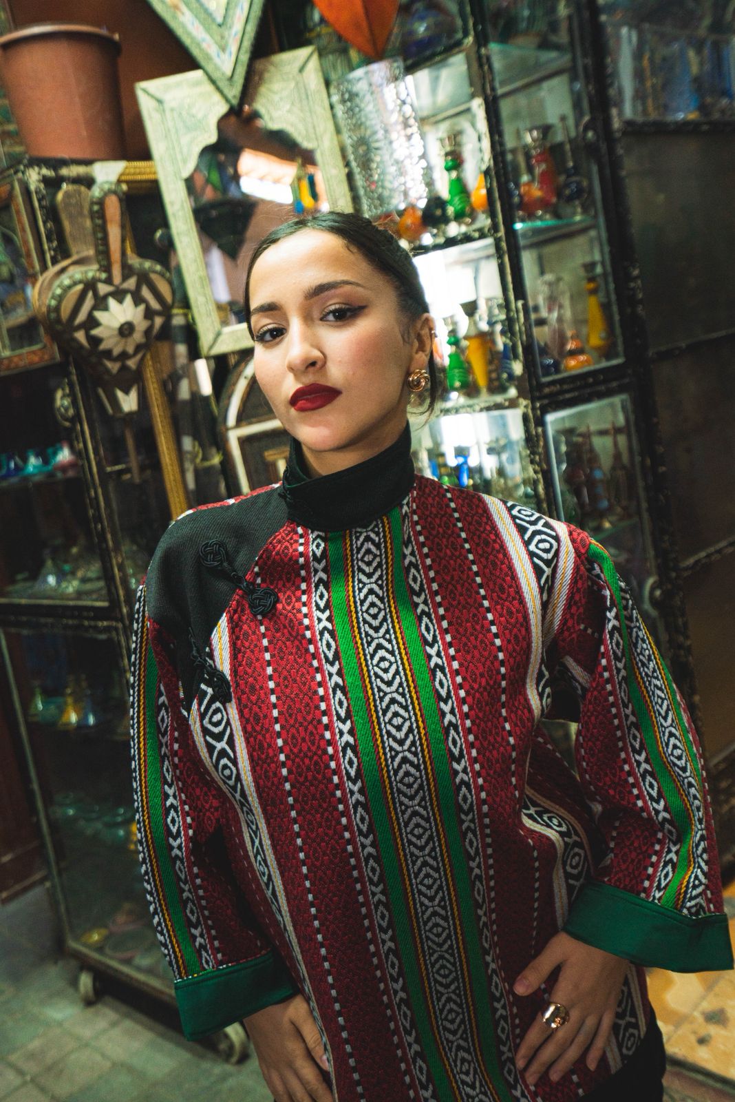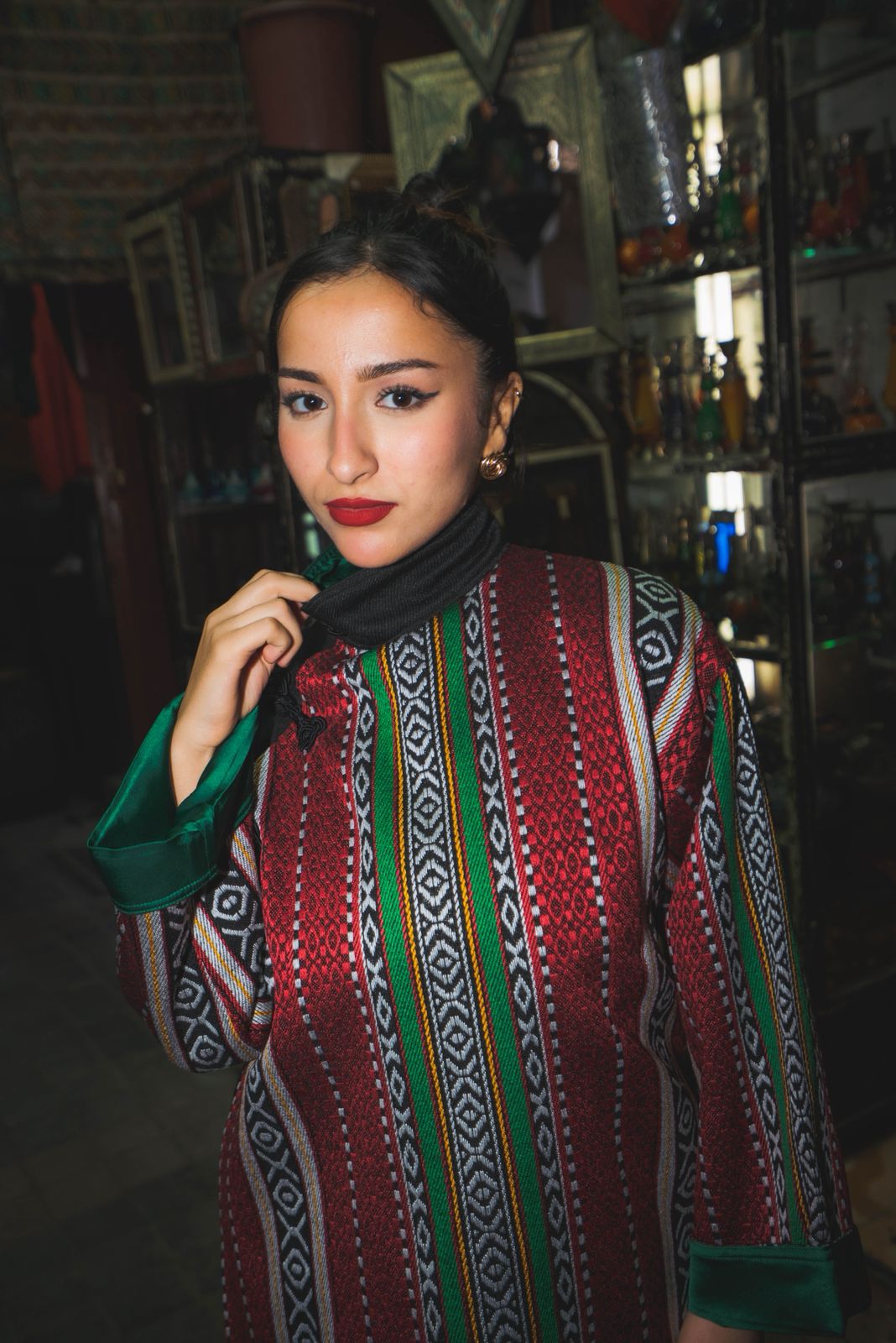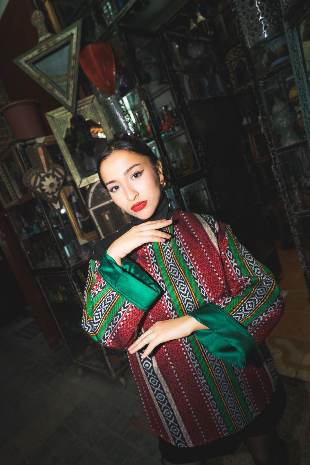 The Tokyo tunic blends the elegance of a traditional Japanese kimono with the authenticity of Moroccan artisanal fabric. As the statement piece of the outfit, it stands out with its royal green lining, giving it a distinctive and refined touch. A bold and remarkable creation.